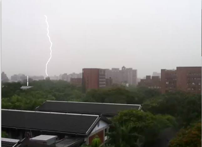 It typhooned outside today.  “Typhooned” is a past tense verb, born into the English language approximately 5 seconds ago for the purpose of describing this weather.  The thunder actually set off car alarms.  The loudest blow was far and away the loudest thunder I’ve ever heard.  I actually screamed.  Jessica captured this wicked lighting—
