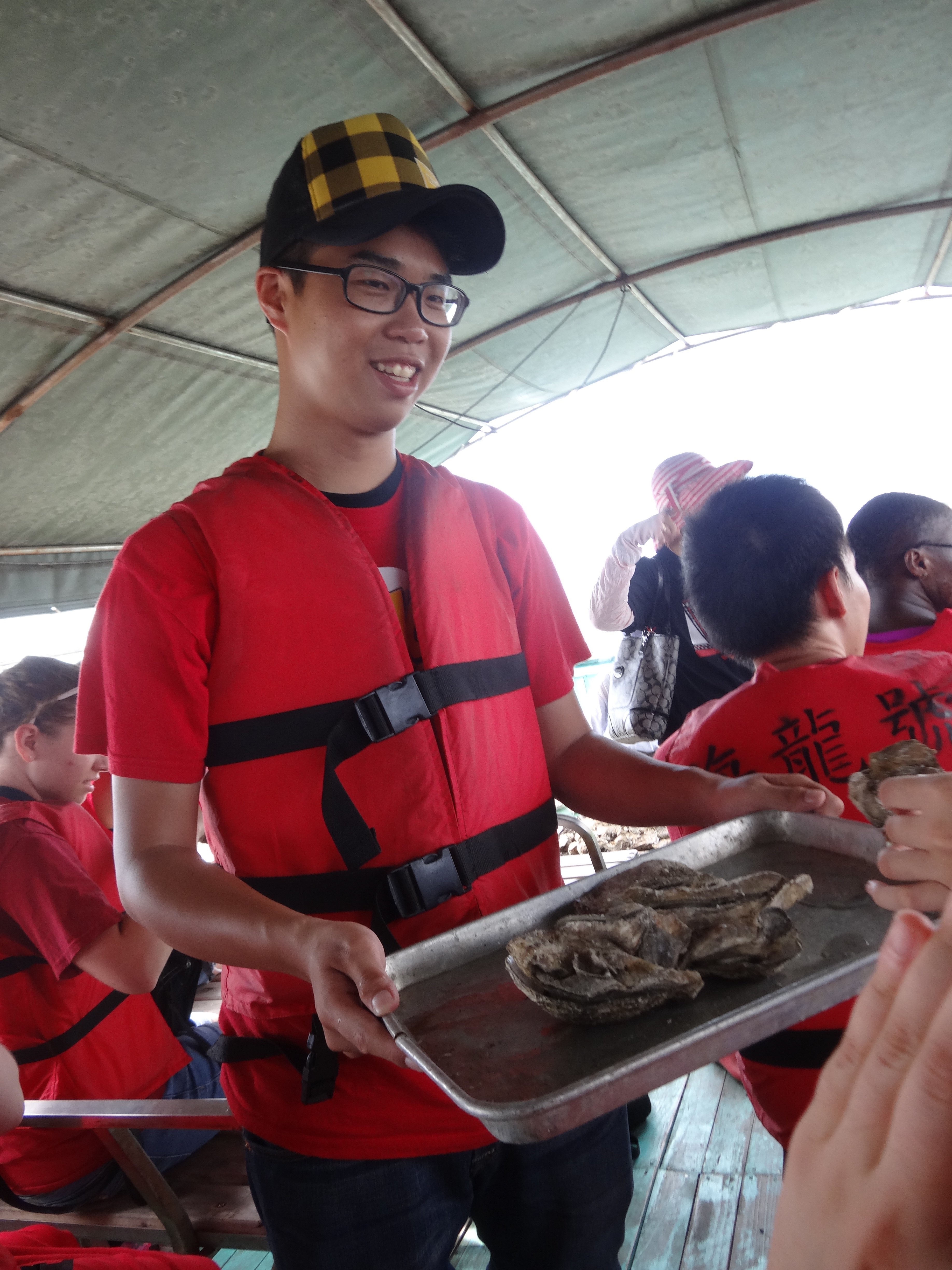 Oyster farmers hang oysters on bamboo platforms (pictured first), and new oysters naturally grow off of them.  On the boat, they cooked fresh oysters on a little grill and handed them out.  Fresh oysters for everyone!